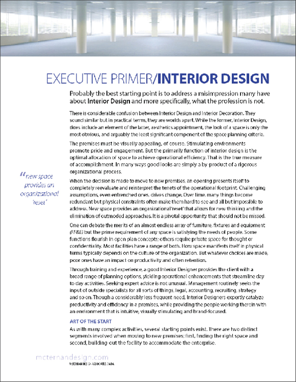 Any interior design firm will help you evaluate space options as part of their service. McTernan Design Associates offers a no strings, flat rate evaluation of up to three spaces, with a report comparing the pros and cons of each; fast, easy and very attractively priced. It is intended as an introductory offer, of course, but available regardless of whom you ultimately select to plan your new space.