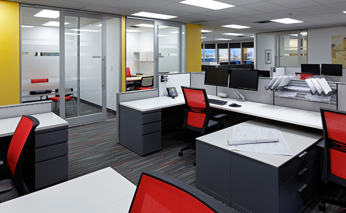 The lifeblood of creativity is a free-flow of ideas. Low partitions as well as a collaborative pod configuration, allows those next to you, as well as those on the other side of the room, to informally gather throughout the space. This configuration is substantially more efficient than formal meeting rooms because the gatherings can be serendipitous, flexible in size and close to individual technology and project resources. There are also formal meeting rooms, one seating up to 20, as external project teams can be large. An oversized lunchroom/cafe doubles as an amenity and a less formal meeting space ideal for full staff functions.