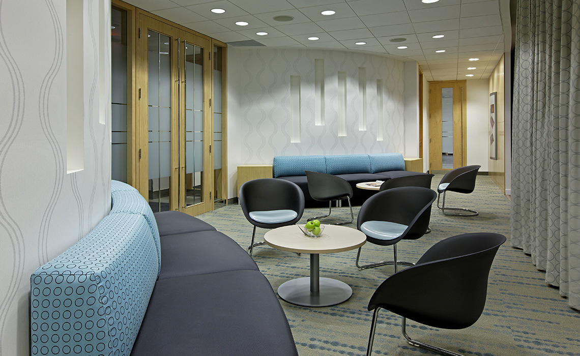 Furniture was visually light and meeting rooms cordial. Open planning supported collaboration and social space was soft and inviting. Occupancy occurred well before transit became available so special amenities were included to entice support staff to make the long trek from the City. The facility successfully attracted a full roster of talented people from other offices and a subway, delayed for years, is about to open its doors (or so we're told).