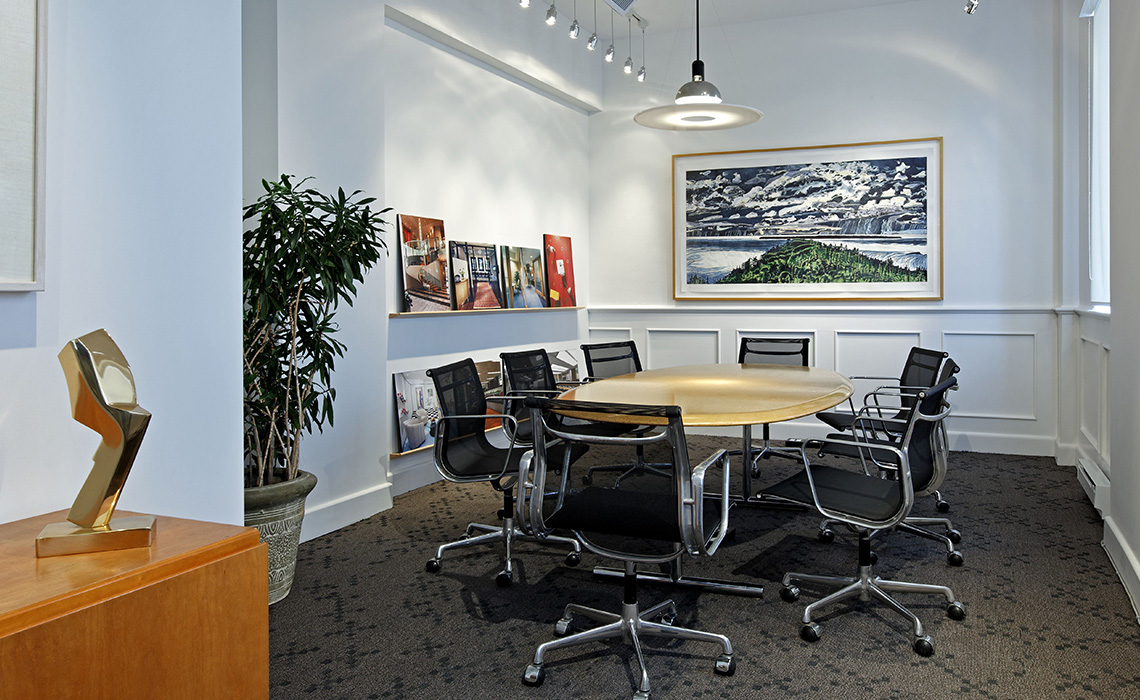 The ground floor hosted reception, of course, plus a large and small meeting room and lavish gathering space between the two with built-in hospitality infrastructure. Further into the ground floor were ten additional work stations and a partner's office. The basement included a kitchen, staff lounge area, resource library, three sample rooms, computer server and a large archival storage room.